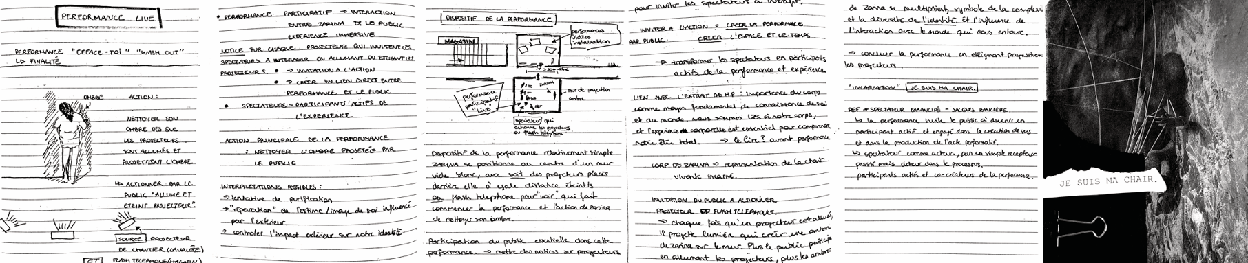Ces recherches ont donné naissance à une série d’expériences performatives, pensées comme des tentatives d’exploration des mécanismes intimes et sociaux qui façonnent la perception de soi. Chaque performance est née d’un dialogue entre réflexion et expérimentation sensible, pour questionner la manière dont l’image du corps se construit, se fragmente et se transforme sous l’influence extérieure.